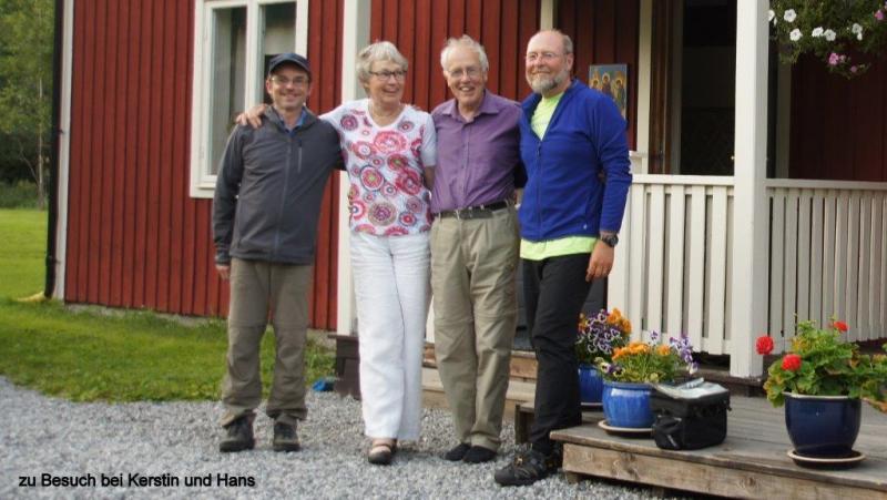 Auch wenn der Erholungsschlaf kurz war, hat der Tag Pause mal wieder gut getan, da wir unsere Räder gestern auf Vordermann haben bringen können. So kurz nach 24:00 Uhr machte die Liveband mal Pause und wir dachten schon, dass wir nun zur Ruhe kommen können. Aber weit gefehlt, sie holten nur noch einmal Anlauf um ins Finale zu starten, um dann gegen 01:30 Uhr endgültig uns die nötige Bett- (Thermarest-)ruhe zu gönnen. Trotz allem fühlen wir uns ausgeruht, als wir so um 6:30 Uhr wegen der Übertemperatur im Zelt (die Sonne strahlt mit voller Kraft aufs Zeltdach) volle Pulle einfinden. Nach dem kurzen heftigen Schauer vom Abend vorher ist nun wieder strahlend blauer Himmel und lässt uns schon unruhig werden, um endlich wieder in die Pedale treten zu können (ok, soll ein Witz sein!). Heiner war nachdem er gestern Abend eigentlich zum Tanzen gegangen war, schon nach wenigen Minuten wieder zurück, da ihm die Musik nicht zugesprochen hatte und schon gegen 21:00 Uhr im Zelt verschwunden. Nun am Morgen saß er und schrieb am Blog, als ich wach wurde. Die schöne Küche nutzen wir noch ausgiebig zum Frühstücken und dann schwingen wir uns bei strahlendem Sonnenschein auf die Räder. Die ersten Kilometer geht es über die E4, die allerdings einen breiten Seitenstreifen hat und somit uns ausreichend Platz lässt. Danach geht es in die Höga Kusten. Es ist ein wunderschönes Gebiet mit hohen Bergen, eingeschnittenen Küstentälern und vielen Bergseen. Heute weitestgehend über asphaltierte Straßen, aber wieder mit vielen Kletterpartien. Das schöne Wetter lässt die erblühten Seitenstreifen in den schillerndsten Farben erstrahlen und man möchte am liebsten alle diese Eindrücke fotografisch festhalten, was nicht geht. Es gibt Streckenabschnitte, wo uns eine ungewohnte Stille umgibt. Nur das Rauschen des Blätterwaldes als Untermalung. Wir nehmen das Pfeifen der Vogelwelt wahr, oder aber stopp, nein, es ist der eigene Atem, wenn wir mal wieder eine Bergkuppe überwunden haben. Da, das hohe Gepiepe der Feldlerche, hier in der Bergwelt? Noch einmal genau hinhören! Ist es etwa das linke Pedal, das nach den Regenfahrten in letzter Zeit etwas die Schmierung der Klickauslösung verloren hat? Sind wir jetzt mit der Natur vollends in Einklang gekommen? Wir fahren an dem Städtchen Nordingrå vorbei und der Wind wendet sich uns jetzt mit voller Energie entgegen. Windschattenfahren ist angesagt, aber nur schwer zu nutzen. Manch einer versucht es erst gar nicht und hat später seine Schwierigkeiten, die kurze aber anstrengende Tagesetappe zu schaffen. Für die anderen ein Problem immer aus dem gewöhnlichen „Tritt“ zu kommen, warten und neu anrollen zu müssen. Endlich können wir die Höga Kusten verlassen und steuern auf Kramfors zu. Hier muss aber erst einmal eine Brücke über den Ångermanälven überquert werden. Hinter der Brücke gibt es ein Automuseum und hier findet heute ein Oldtimertreffen statt, das uns zum Pause machen einlädt. Noch viele Hügel wollen überwunden werden, bis wir endlich unser Ziel Kramfors erreichen. Wie mit meinem Freund Hans vereinbart, teile ich unsere Ankunft in Kramfors mit. Hans ist aber noch unterwegs und Kerstin hat auch noch Verpflichtungen. Wir vereinbaren, dass wir uns abends um 19:00 Uhr in ihrem Haus treffen. Nach dem Auffüllen der Vorräte suchen wir den etwas versteckten Campingplatz und bauen unsere Zelte auf. Danach machen wir uns stadtfein und fahren über Feldwege zum nahegelegenen Haus der beiden. Herzlich ist die Begrüßung mit Hans, der auf der Veranda vor seinem Haus sitzt und in einem Buch liest. Kerstin kommt etwas später, da sie noch mit ihrem Chor in der nahe gelegenen Kirche gesungen hat. Sie hat für uns 2 verschiedene leckere Quiche gemacht. Eine mit Käse und die andere mit Oliven und Tomaten. Es werden die Begebenheiten der letzten 19 Jahre seit unserer Nordkap-Reise kurz erläutert. So kann ich berichten, wie die Entwicklung der damaligen Teilnehmer abgelaufen ist. Daniel wird als mittlerweile promovierter Soziologe eine Professur in Aachen aufnehmen und ist bereits stolzer Vater. Genauso, wie Stefan bereits einen Sohn hat und Architekt ist. Simeon hingegen hat noch keine Kinder und ist als promovierter Ökonom einer der wichtigsten Konjunkturforscher in Deutschland. Hans berichtete von seinen Kindern. Eric wohnt noch zu Hause und wird mit Freunden, die eine ähnliche gesundheitliche Beeinträchtigung haben (Downsyndrom) am Montag an einer Freizeit teilnehmen und ist daher sehr nervös und mag nicht so richtig in Kontakt zu uns treten. Hans ist seit einigen Jahren pensioniert, nimmt aber noch regelmäßig Vertretungsaufgaben für seine Pfarrerkollegen war. Er hatte am Anfang des Jahres eine schwierige Magenoperation und so kritisch es auch war, hat er daraus neue Kraft gewinnen können, um seinen Bestimmungen weiter nachzugehen. Da Heiner gesellschaftspolitische Themen, hier insbesondere zur Haltung der Schweden im 3. Reich und die Situation der heutigen Jugend in der Kirche im Allgemeinen diskutieren wollte, die aufgrund der mangelnden Englischkenntnisse zu manchen Irritationen führten, blieb die Unterhaltung sehr unbeständig. So lief uns dann nach gut 4 Stunden der Gesprächsstoff aus. Ich hatte Hans gebeten, am morgigen Tag, dem Sonntag, an einem Gottesdienst teilnehmen zu dürfen, den er halten wird. Hans bot an, da die Kirche ca. 20 km entfernt ist, uns mit dem Auto am Campingplatz abzuholen. Wir verabschiedeten uns dann auf den morgigen Tag.