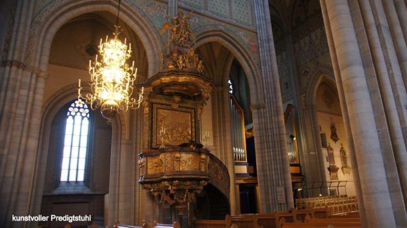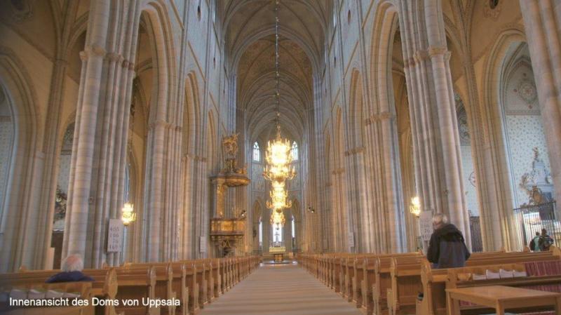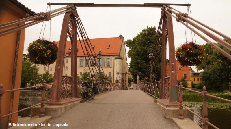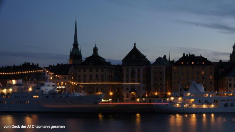 6:30 geht Karl-Josef duschen. Ich bleibe noch bis 7:00 Uhr liegen und mache mir bewusst, dass heute Sonntag ist. Heute gibt es für die Jungs deshalb auch zwei Spiegeleier. Es zieht sich zu und wir beeilen uns, die Zelte ins Trockene zu bekommen. 9:30 Uhr fahren wir dann los und ich wundere mich sehr, wie dieser Campingplatz mit den geringen Kapazitäten und ohne Kühlschrank 4 Sterne bekommen konnte. Es ist kaum Verkehr und wir können die sehr ansprechende Innenstadt in Ruhe genießen. Alles beherrschend steht der mächtige Dom zu Uppsala im Zentrum der Stadt. Mit einer Länge von 118,7 m, einer Turmhöhe von 118,7 m und einer Deckenhöhe von 27 m ist der Dom die größte Kirche der nordischen Länder. Seine Bauzeit dauerte von 1270 bis 1435. Jahrhundertelang wurden hier die schwedischen Könige gekrönt. Wegen der Reliquien Eric des Heiligen ist sie zugleich Wallfahrtskirche. Die Kirche strahlt im Inneren sehr viel Wärme aus. Als wir weiterfahren fängt es an zu regnen, was bis 12:00 Uhr anhält. Die beiden Kameraden beschließen um 13:00 Uhr eine Gaststätte aufzusuchen, um die nasse Kleidung zu wechseln. Wir landen in einem ansprechenden Westernsalon ganz aus Holz und sind mit dem Essen zufrieden. Allerdings gibts keine Westernmusik, sondern nicht so angenehme Rapmusik. Dann gehts weiter bei schönstem Wetter in die City Stockholm. Erst mal müssen wir uns allerdings durch die Vororte quälen. Überall Baustellen, wo auch noch am Sonntag gearbeitet wird. Dann werden wir aber durch die überwältigende Innenstadt entschädigt. 17:30 Uhr Ankunft an dem majestätischen Dreimaster, der Af Chapman, die Jürgen vorab gebucht hat, weil er dort schon vor 18 Jahren war. Dort wollen wir drei Mal übernachten. Wir sind schon sehr gespannt, was uns erwartet. Aber die Kajüte mit drei Doppelbetten ist nicht so klein, wie ich befürchtet hatte und hat zwei geöffnete Bullaugen. Wir essen unseren morgens vorbereiteten Proviant am Heck des Schiffes und schauen der STS Berlin beim Ablegen zu. Dann stellen wir fest, dass die Sanitäranlagen viel besser als auf so manchem Campingplatz sind und fühlen uns auf dem Riesensegelschiff schon richtig wohl.