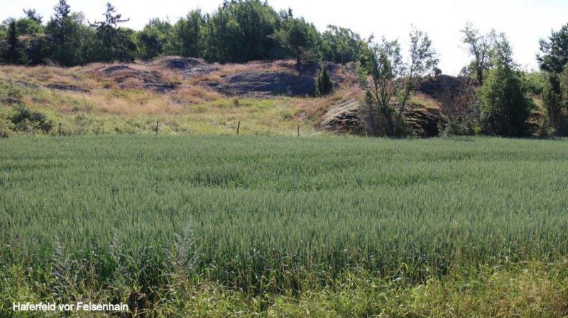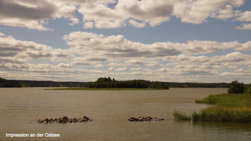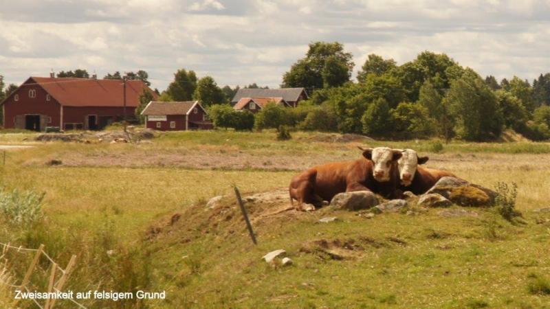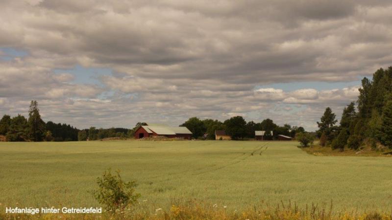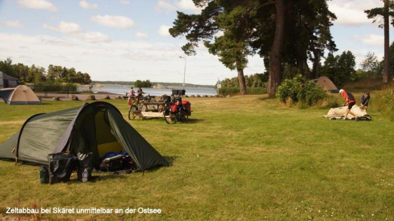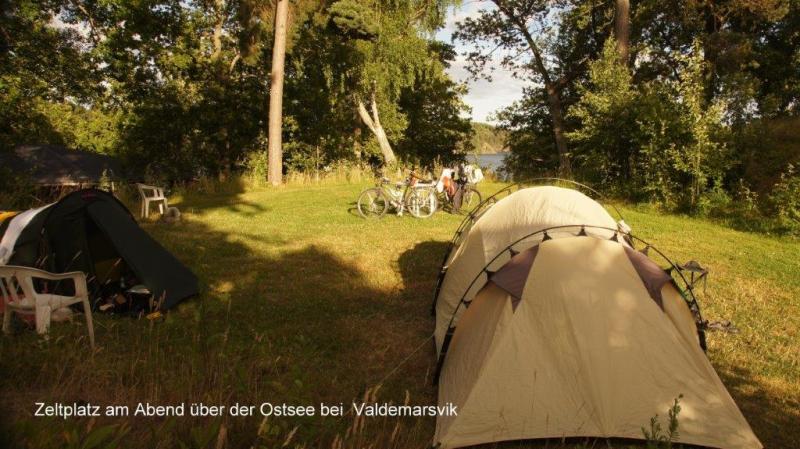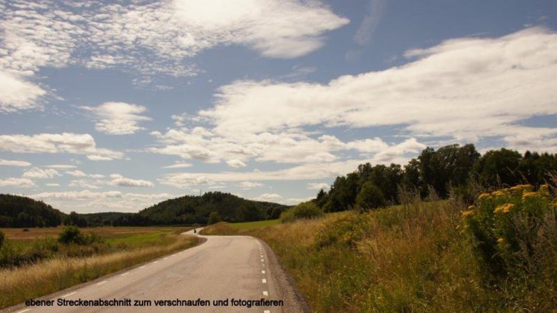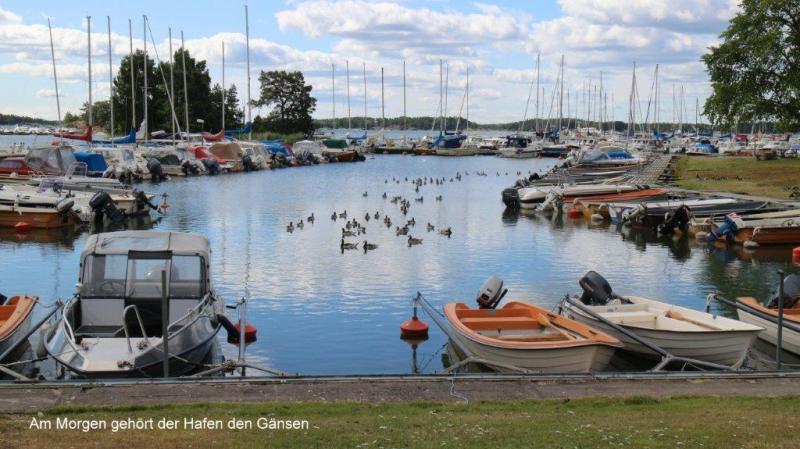 Ich wusste was vor uns lag. Die unmittelbaren Küstenbereiche hier im Süden, ca. 150 km Radweg von Stockholm entfernt, haben es in sich. Ein ständiges Auf und Ab haben wir zwar des Öfteren schon beschrieben, aber hier ist die „Qualität“ anders. Es geht in sehr kurzen Abständen steil nach oben, um sofort wieder in Schussfahrt „abzutauchen“. Das ist nötig, um die ständigen kleinen Hubbel, die die Natur als Fels in den Weg gestellt hat, zu überwinden. Ein letzter Blick in den kleinen Hafen und Abschied von einem Campingplatz mit überwiegend älteren Dauercampern und einer Riesenschar Gänse (botanischen Namen noch nicht herausgefunden) am Morgen im Wasser und nachts auf den Wiesen des Platzes. Dort hinterlassen sie ihre Stoffwechselendprodukte, die den Zeltgästen immer wieder Sorgen bereiten. Zurück zur Strecke. Schon die ersten 8 km bis zur Fähre nach Skenäse gehen ohne morgendliches Aufwärmen sofort in die Beine. Die schmale asphaltierte Straße führt uns wie erwähnt in einer Achterbahn ständig auf und ab. Der Wegverlauf folgt den Gegebenheiten der Landschaft ohne jeden Ausgleich. Die Natur bzw. das Heben der Gebirge vor 10.000 Jahren schuf die vielen tiefen Meereseinschnitte. Manchmal wissen wir gar nicht, ob wir es mit einem See oder einem Einschnitt der Ostsee zu tun haben. Sie werden umfahren, mit Brücken oder Dämmen überbrückt bzw. mit Fähren überwunden. Wir folgen bis Östra Husby den Cykelspåret um dann die Route direkt nach Süden zu suchen und fahren den mit „Kustlinjen“ ausgeschilderten Weg weiter. Dieser führt uns natürlich mal wieder auf einen Schotterweg. Staub, rappelnde Radtaschen und die Gefahr von Schlaglöchern und damit „Speichenbruch“ ist möglich. Das letzte Drittel der Strecke ab dem Ort Rullerrum befahren wir den Cykelspåret (Asphaltstrecke) in Richtung Valdemarsvik. Die Landschaft verändert sich. Die sehr küstennahen „Buckel“ verwandeln sich in seichtere Hügel. Immer breiter wird die landwirtschaftliche Nutzfläche. Eines meiner „Lieblingsgerichte“ (bzw. Gemüse) wird hier auch angebaut. Ich rufe zu Jürgen: „Ein riesiges Feld mit dicken Bohnen“, er bestätigt: „Lecker – mit Speck“. Und das ist nicht alles, Erbsenfelder, Hafer, Roggen und Weizen wachsen hier. Natürlich sehen wir Milchvieh und Kälber auf den Weiden. Die Felder werden weiterhin durch Felspartien unterbrochen, auf denen sich Schafe oder Kälber in der Sonne wärmen. Übrigens Thema Sonne: die begleitet uns trotz einiger Wolkenberge ständig. Der Fahrtwind sowie der angenehme Rückenwind heute sorgen jedoch dafür, dass ich immer zusätzlich meine „Windstopperweste“ trage. Die Großstadt Valdemarsvik liegt im Landesinneren und doch an der Ostsee. Der Vandemarsviken ist ca. 14 km lang und damit ein schmaler und tiefer Einschnitt in die Küste Südschwedens. Unser Zeltplatz liegt südlich der Stadt und zwar in der Nähe der Ostsee an diesem „Fjord“, sie ist aber wegen der felsigen Steilküste von uns nicht direkt erreichbar. Hüglig ist auch der Campingplatz. Wir richten uns mit dem Zelt wie immer darauf ein und suchen – wie immer – die Nähe zur Campingplatzküche und damit des Servicehauses. So kann bei Steckdosen in der Küche auch das Notebook genutzt werden. Heiner kocht: Reis mit Spinat und vier Lachsschnitten. Alles schmeckte sehr gut. Kalorien sind nach einer 90 km Tour mit viel auf und ab wichtig. Wir gehen nie mit leerem Magen ins Bett bzw. in den Schlafsack.