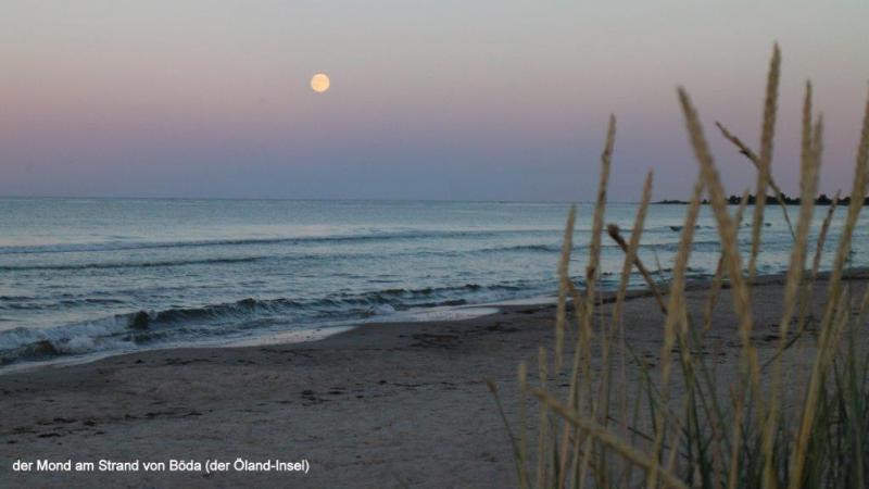 Der Plan für heute war einfach und klar. Keine Karte war nötig, keine Überlegung wo gehts lang. Vom Zeltplatz im Ort Figeholm zur Stadt Oskakarshamn sind es 24 km bis zum Fährhafen. Dort wird um 14:00 Uhr die Fähre zur Ölandinsel abfahren. Die Sonne verwöhnte uns auf unserem Zeltplatz. Nach einem wie immer ausgiebigen Frühstück, natürlich im Freien, ist der Ablauf wie an jedem Tag. Packen der Radtaschen und Zeltabbau wird fast schon „im Schlaf“ erledigt. Das seit Tagen trockene Wetter beschleunigt die Abläufe, so dass wir ohne Hetze (müssen ja erst mittags die Fähre nehmen) um 10:00 Uhr starten. Der Cykelspåret führt uns zunächst nach Süden um dann nach 15 km zur E22 gegen Westen neben der Schnellstraße auf einem Radweg nach Süden zu kommen. Entgegen der Radroute nutzen wir 1 km Strecke auf der E22 um zu einer westlich verlaufenden Nebenstraße direkt zum Ziel zu kommen. Gegen 11:30 Uhr waren wir im Hafen. Vom Abfahrpunkt der Fähre keine Spur. Vorher wiesen große Straßenschilder auf die zwei Abfahrplätze der Fähren zur Insel Gotland und Öland hin. Erst nach dem Jürgen mehrere Passanten befragt hatte, finden wir einen unscheinbaren Hinweis mit dem Abfahrtspunkt. Personenwagen (es wurden nur reservierte Autos mitgenommen, da seit Wochen ausgebucht) und viele Mitreisende zu Fuß wie auf dem Fahrrad fanden sich ein, um dann pünktlich die Fähre zu besteigen. Ein scharfer Nordwind hatte uns schon bei der Radtour den Weg nach Süden beschleunigt doch nun auf dem Schiff konnte es unangenehm werden. Das war es dann auch. Das kleine Fährschiff Baujahr 1964 pflügte sich tapfer durch die recht hohen Wellen. Das Land entschwand nur langsam und die sehr große Fähre nach Gotland überholte uns in der Ferne anscheinend mühelos. Sie hatte in Oskakarshamn angelegt, als wir aus dem Hafen fuhren. Wir hatten im Oberdeck dick vermummt Platz genommen und ich beobachte das Auf und Ab der Wellen sowie das Treiben an Bord. Seekrank bin ich nicht geworden. Die Überfahrt dauerte 2 ½ Stunden. Im kleinen Hafen von Böda war alles eng. Im Segelsporthafen zwängten sich die Boote dicht nebeneinander. Der PKW-Parkplatz war überfüllt. Die auf die Fähre wartenden Autos kamen kaum an den herausfahrenden vorbei. Eine gute besuchte Ferieninsel erwartete uns. Wir „schwammen“ mit dem dichten Verkehr auf die Westseite Ölands, die hier, im Norden der fast 100 km langen Insel, die meisten Campingplätze auswies. Direkt der erste Campingplatz bei Mellböda gefiel uns, da er nicht zu groß war. In den freien Monaten sind die Plätze voll belegt und auf den „großen“ ist daher nur „Ferienrummel“ mit vielen Wohnwagen und teilweise sehr großen Zelten zu erwarten. Unser Zeltplatz ist umringt von Wohnwagen und Langzeitferiengästen. Wir stellen uns dazwischen und erobern die Küche. Ich nutze die hier überall verfügbare Mikrowelle um Spinat aufzutauen. Heiner brät Gehacktes und dazu gibt es Reis. Nach dem Essen möchte ich den Strand kennenlernen, auf den die Schweden alle so wild sind. Ein breiter feiner Sandstand mit Dünen erwartet mich. Sandstrände sind an der schwedischen und finnischen Ostsee sehr selten und daher wohl sehr beliebt. Wie oft beschrieben, führt der felsige Grund bis ins Wasser. Statt wie auf der finnischen Seite ein gewohnter Sonnenuntergang über dem Meer, strahlt mir ein hell leuchtender Vollmond über der Ostsee entgegen. Mein langer Spaziergang hat mich müde gemacht und ich bin gespannt auf die morgige Radtour über die Insel.