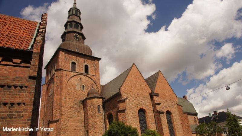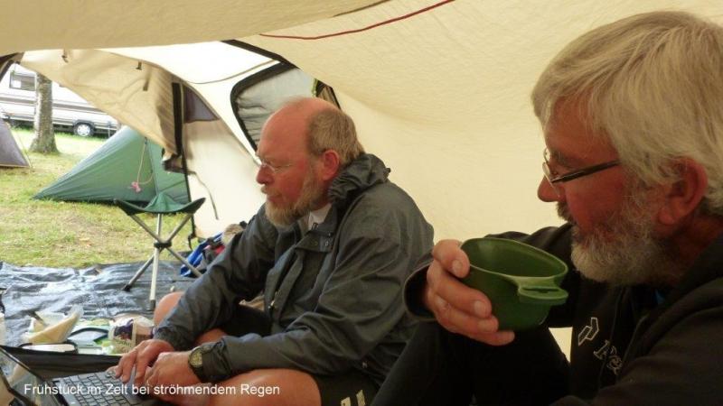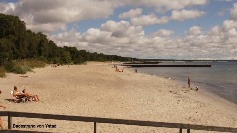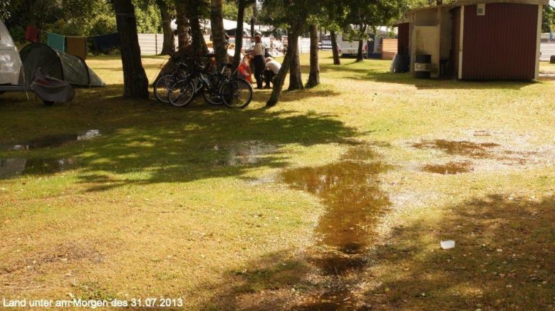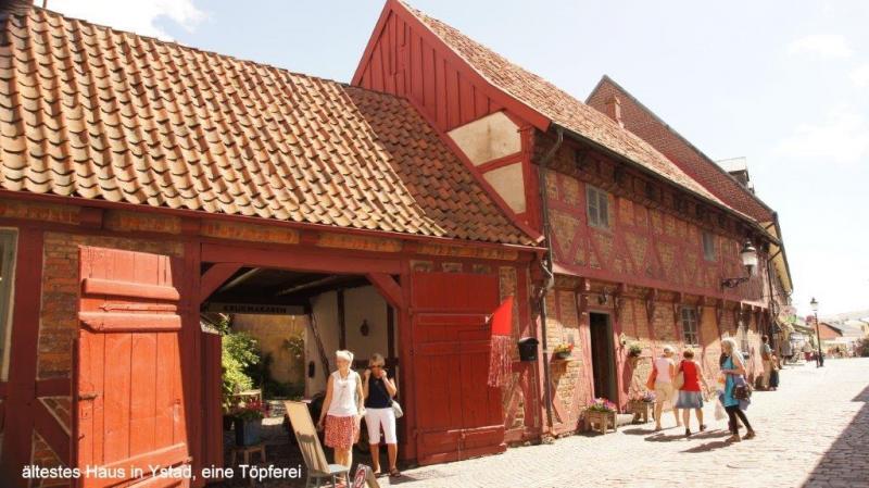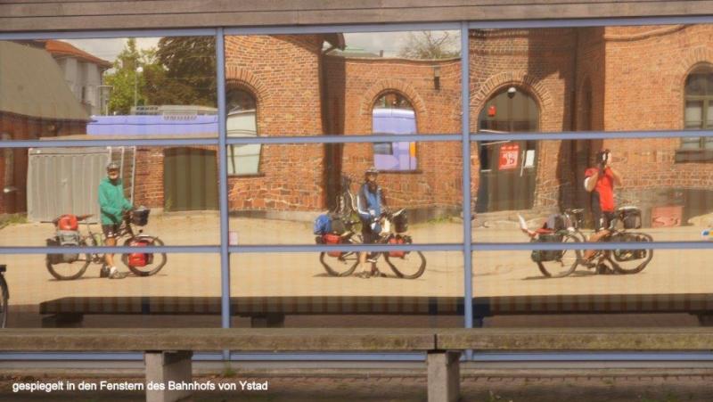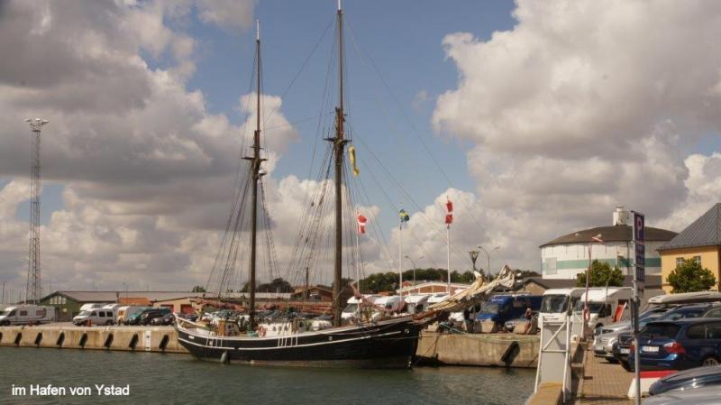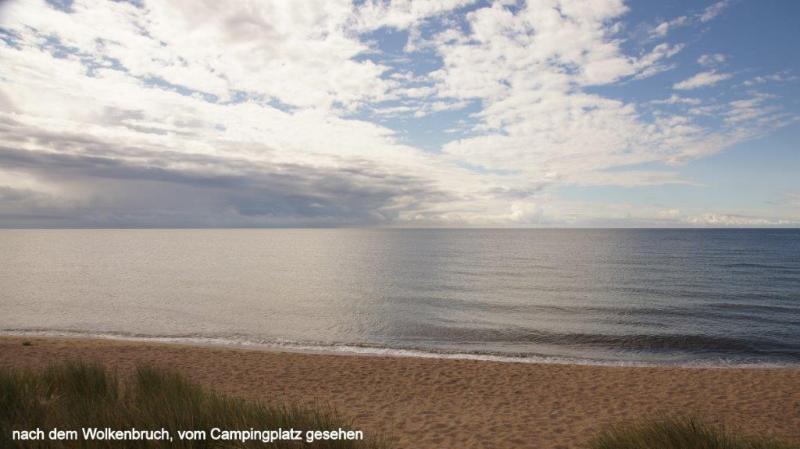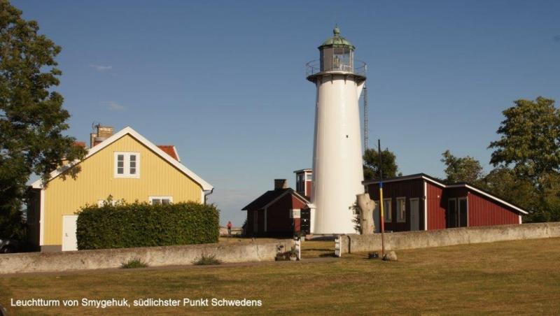 Trommelnder Regen kann im Zelt einschläfernd wirken. Diesmal wurde ich mit dem Gedanken wach „nicht schon wieder“! Gestern hatten wir ja schon nass abgebaut. Der 2. Gedanke: Rumdrehen und weiterschlafen! Gegen 7:30 Uhr musste ich raus; es hatte ja auch aufgehört zu regnen. Der Himmel war tief grau verhangen. Duschen und dann frühstücken. Die Sitzgruppe draußen vor der Küche wurde getrocknet und die leeren Ortliebsäcke als Sitzpolster ausgelegt. Meine schöne Blümchentischdecke breitete ich auf dem groben Holztisch aus. Heißes Wasser war für Kaffee bereit – aber nun goss es wieder in Strömen. Schnell alles zusammengepackt, mein Vorzelt ausgeräumt bzw. die Taschen zur Seite gedrückt und die Blümchentischdecke auf den trockenen Boden des Vorzeltes ausgelegt. Sonst alles wie gehabt. Frühstückszubehör auf die Blümchentischdecke usw. Ich genoss trotz der Enge mit 3 Personen und allen Utensilien das Frühstück – nur der Nachschub des heißen Wassers war durch den Regen zur Küche etwas anstrengend – funktionierte aber. Packtaschen können auch im Zelt eingeräumt werden, nur Heiner bedauerte, dass er keine Sachen zum Trocknen draußen aufhängen konnte. Die Zeit wurde genutzt, um den Blog versandfertig zu erstellen, denn wir wollten ihn dann im Touristenbüro in Ystad (freies WiFi) versenden. Gegen 11:00 Uhr schien die Sonne mit voller Kraft und so wurde das Zelt noch halbwegs trocken. Auch Heiner freute sich über einige trockene Sachen und so stand einem Start zunächst nach Ystad nichts mehr im Wege. Die Stadt ist, wie Jürgen gestern schon geschrieben hat, vom Namen her für viele Krimileser und Fernsehzuschauer spannender Unterhaltung ein Begriff. Die wenigsten wissen aber, dass Ystad einer der größten Umschlaghäfen für Güter von Schweden in die ganze Welt ist. Eine ganze Armada riesiger Fähren und wartender Laster sehen wir in einem supermodernen Hafen. Dabei hat alles mal ganz klein angefangen. Das Tor nach Süden und zum Kontinent bestand damals wie heute aus dem Hafen. Das Postschiff nach Stralsund, das von hier ablegte, war lange Zeit die einzige regelmäßige Verbindung Schwedens zum Ausland. Die Entwicklung der Stadt begann schon im 12. Jh., weil Bischof Absalon Handelsplätze hinunter an die südliche Küste verlagern wollte. Durch die Hansezeit im 14. Jh. festigte die Stadt ihren Handelsplatz an der Ostsee. Heute ist Ystad auch ein Badeort und natürlich ein Drehort für Mankells Wallander-Filme. Nun weiter zu unserem Zielort Trelleborg. Die Strecke verläuft exakt dem Eurovelo 10 bzw. dem Cykelspåret immer entlang der Küste. Das gibt uns Gelegenheit das Leben hier an dem südlichsten Ende Schwedens aufzunehmen. In Smygehuk beim Ort Smygehamn gehts nicht mehr südlicher. Hier ist der südlichste Punkt Schwedens. Ein Leuchtturm vermittelt das auch über die See. Der Strand ist an dieser Stelle jedoch sehr steinig. Zwischen Meer und Radweg entwickeln sich die unterschiedlichsten Eindrücke einer von Natur und Menschen vorsichtig geprägten Landschaft. Riesige und kleine Findlinge („liegengebliebene“ Steine aus dem Rückzug der Eiszeit) sind allgegenwärtig. Aufgesammelt und zu Mauern aufgeschichtet, bilden sie auch hier ein Schutz für Mensch und Tier. Auf trockenen Brachflächen zur Küste werden Schafe und Rinder gehalten. An den überwiegend sandigen Abschnitten findet, insbesondere in der Nähe der Orte, ein Strandleben mit allem was dazu gehört, statt. „6 005“, rief Jürgen! Wir hatten ein paar Kilometer vor Trelleborg die 6 000 km beim Radweg um die Ostsee überschritten. Handabklatschen sofort (neben einer Weide mit dumm drein schauenden Kühen) und ein kühles Bier (2,8 % Alkoholgehalt) am Abend – so soll gefeiert werden. Der Zeltplatz 3 km vor Trelleborg im Ort Gislövs Lage befindet sich unweit der Landstraße in einem mit großen Kiefern bewachsenen hügligen Gelände. Diesmal gab es zum Abendessen kalten Nudelsalat mit Fleischwurststücken und frischen grünen Salat. Mehr als gut gesättigt kroch ich in den Schlafsack und versuchte gedanklich abzuschätzen, wann und wo wir die 7 000 Grenze wohl überschreiten werden. Der Gedanke wurde nicht zu Ende gedacht, da meine Augen einfach zufielen.