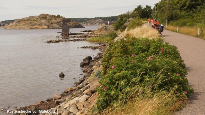 Wir haben etwas Pech mit dem uns zugewiesenen Zeltplatz. Die Toilette ist zwar nur die Ecke herum, aber wir liegen leider im Schatten der morgendlichen Sonne. Da es gestern Abend einen kräftigen Regenschauer gegeben hat, sind unsere Zelte noch pitschenass. Da wir ja in Göteborg 2 Nächte in einem festen Quartier gebucht haben, sollten die Zelte schon etwas trocken sein. Es sind zwar nur noch rund 80 km bis Göteborg, aber wir müssen bis 17:00 Uhr im Vandrarheim einchecken. Daher können wir nicht warten, bis die Zelte komplett getrocknet sind und müssen notgedrungen so einpacken. Wir fahren heute weitestgehend unmittelbar an der Küste vorbei, was einen besonderen Reiz hat. Die Möglichkeit auf weiten Strecken die Ostsee im Blick zu behalten, haben wir eigentlich auf unserer Tour noch nicht erlebt. In Polen und im Baltikum waren es zumeist Dünen, die eine Barriere bildeten, in Finnland war die Wegstrecke in der Regel auf Distanz zur Küste und in Finnland und überwiegend bei der Ostseite der schwedischen Küste waren es durchweg bewaldete Streckenabschnitte, die den Blick versperrten. Nur auf den Åland-Inseln kamen wir der Küste vergleichbar nahe. Seit dem 26. Juni 2013, d.h. seit 42 Tagen sind wir nun in Schweden unterwegs, die mit Abstand entfernungs- und zeitmäßig längste Etappe unserer Ostseeumrundung. Im Rückblick kann festgehalten werden, dass Schweden eine unglaubliche Vielfalt an unterschiedlichen Landschaftsformen bietet. Im stärker besiedelten Süden gibt es auch gut ausgebaute und beschilderte Fahrradrouten. Es bleibt aber bei vielen Mängeln bei der Auswahl, Gestaltung und Ausschilderung der Wege. Schweden ist ein teures Land und wir lassen uns einmal überraschen, wie es in Dänemark sein wird. Ein zwischenzeitlicher Blick auf unsere Ausgaben hat ergeben, dass wir nicht kostengünstig reisen, da die Nutzung von Campingplätzen und unsere täglichen Ausgaben fürs Essen einen gewissen Kostenrahmen erfordern. Dies auch, obwohl wir in Schweden durchweg immer selber gekocht haben. Es kommen die verschiedenen Fährfahrten hinzu, Eintrittsgelder und die festen Unterkünfte in den Großstädten. Aber ein standardisierter Urlaub, der über eine so lange Zeit geht, würde natürlich ein Vielfaches kosten. Wir sind hier in Schweden auf ganz unterschiedliche Verhaltensweisen der Menschen getroffen, wie Besucher in Deutschland uns sicher auch in wechselnden Stimmungen antreffen. Wir erlebten Autofahrer, die an Kreuzungen anhielten und fragten, ob sie uns helfen könnten, als wir in unseren Landkarten nach dem richtigen Weg suchten. Aber es gab auch Bewohner, die sich uns gegenüber eher distanziert verhielten. Die Häuser und Grundstücke sind alle sehr gepflegt und es ist ein höherer Wohlstand festzustellen, als bei uns in Deutschland. Ferienblockhütten, Boote und fast nur Autos der Oberklasse. Die Vorliebe für riesige amerikanische Oldtimer-Schlitten, aber Oldtimer auch in allen anderen Formen, gerade bei Jugendlichen, sind auffallend. Es bleibt die Frage, wovon leben die Schweden eigentlich, insbesondere in den abgelegenen Dörfern im Norden und in Mittelschweden. Im nördlichen Bereich sind die Einkaufsmöglichkeiten mitunter selten bis schwierig, während es hier im Süden eine ausreichende Auswahl an Geschäften gibt, mit einem reichhaltigen Angebot. Hier hat erfreulicherweise insbesondere die Auswahl und die Qualität der Brotsorten gegenüber meinem letzten Besuch deutlich zugenommen. Die Campingplätze haben durchweg saubere Toiletten und Waschmöglichkeiten sowie alle in unterschiedlichen Ausstattungen eine Küche, wie man sie in Deutschland oder südlicheren Ländern kaum findet. Aber gerade jetzt in der Ferienzeit als Hochsaison sind die Plätze kaum zur Erholung oder zum Verweilen geeignet und wie bereits mehrfach angesprochen, recht teuer. Uns war, wie auf unserer nun schon über 3 Monate andauernden Tour, auch in Schweden das Wetter wohlgesonnen. Die West- und Südküste Schwedens ist bis auf nur noch wenige Steigungen eher flach, während die Ostküste lange, z.T. auch kürzere, dann aber auch steilere Steigungen aufweist. Der Cykelspåret als ausgeschilderter Küstenradweg ist eine gute Orientierung, verläuft aber mitunter etwas seltsam und muss jeweils kontrolliert werden. Zurückkommend auf den heutigen Tagesablauf ist festzuhalten, dass das schöne Wetter anhält und es eine Freude ist,an den wechselnden Küstenformationen vorbeizufahren. Wir kommen mittags in Kungsbacka an, wo wir auf dem Marktplatz unsere Mittagspause machen. Danach geht es wieder zur Küste, wo wir eine ähnliche Formation erleben, wie sie uns auf Åland begegnet ist. Mit blank gewaschenen Granitfelsen, die ins Meer verlaufen oder aus dem Meer herausragen. Vor Göteborg gibt es noch einmal eine Ansammlung von Badestränden und der Fahrradweg löst sich dann von der Küste, die hier die Grenze des Kattegatt (Ostsee) zum Skagerrak (Nordsee) bildet. Der Radweg ist sehr gut ausgeschildert, so dass wir keine Mühe haben, durch die Vororte die Innenstadt und das gebuchte Vandrarheim von Göteborg zu finden. Wir sind nun schon um 16:00 Uhr dort und können unser Zimmer dann sofort beziehen. Während Heiner am Blog arbeitet, suchen Karl-Josef und ich einen Markt auf, um noch einige Lebensmittel zu kaufen. Karl-Josef und Heiner gehen abends noch essen, während ich dann im Zimmer noch am Blog arbeite. Zum Abschluss des Tages machen sich Karl-Josef und der Autor noch auf, um die Stadt Göteborg schon einmal zu beschnuppern und die Abendstimmung einzufangen. Ja und es ist nun auch wieder möglich, kurz nach 22:00 Uhr die Stadt in beleuchteter Atmosphäre einzufangen. Aber wir sind von den sich anbietenden Motiven schon etwas enttäuscht und hoffen morgen schönere Motive finden zu können. Nach einem mehr als 2-stündigen Fußmarsch erreichen wir wieder unser Vandrarheim, wo wir es unserem Partner gleichtun und uns ins Bett kriechen. An dieser Stelle sei erwähnt, dass wir nach Übernachtung