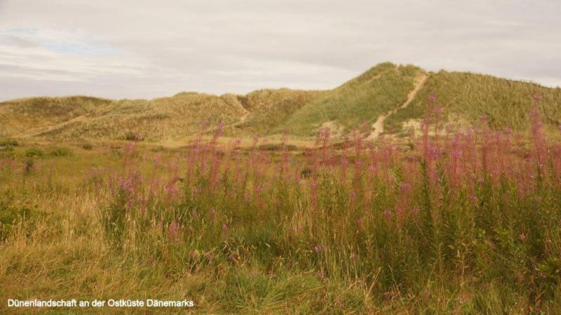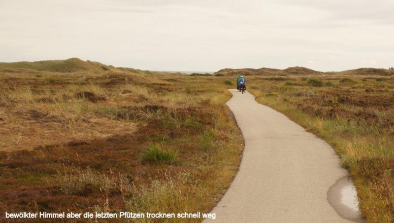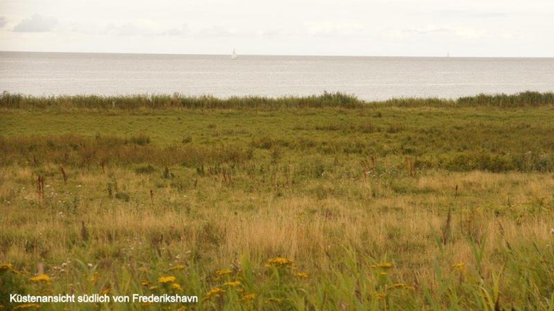 Es hatte sich gestern Abend schon angedeutet und der Regen kommt dann auch über Nacht und hört den ganzen Vormittag nicht mehr auf. Wir hatten den Campingplatz ausgesucht, in der Hoffnung bei Sonnenschein heute Vormittag vielleicht noch klarer die Farbunterschiede der braunen Ostsee des Kattegat und der blau-grauen Nordsee des Skagerrak bei anderem Lichteinfall sehen zu können. Da wird nun leider nichts draus. Stattdessen sitzen wir hier auf dem Campingplatz fest. Aber zum Glück gibt es einen großen Aufenthaltsraum und in diesem sogar Steckdosen, um unsere diversen elektrischen Geräte aufzuladen. Hier in Skagen ergeben sich verschiedene Gespräche mit Tourenradlern. So ist ein dänisches Ehepaar mit einem Tandem und Anhänger unterwegs, wie ich es verschiedentlich mit Elisabeth auch gemacht habe und wir tauschen unsere Erfahrungen aus. Ein junges Pärchen das in Köln studiert, werden wir am Abend wieder treffen. Auch unterwegs treffen wir hier an der Ostküste nun häufig entgegenkommende Reiseradler, die für wenige Wochen ihre Touren machen. Es ist natürlich immer besonders interessant, wenn wir gefragt werden, wohin wir unterwegs sind und woher wir kommen. Besonders effektvoll ist es, nach Süden zu zeigen und zu antworten, dass ich auf dem Weg nach Hause bin und wenn ich dann zurück zeige und erkläre, dass ich rund 7000 Kilometer aus dieser Richtung komme. Es folgt dann immer ein ungläubiger Blick und am liebsten erklärt Heiner den Fragestellern dann sehr ausführlich, welchen Weg wir auf uns genommen haben. Der Regen verschafft uns die nötige Pause, um Blogs fertig zu machen. Hierzu möchte ich einmal unsere unterschiedlichen Beweggründe darlegen, warum wir diese Arbeit auf uns nehmen. Ja, es ist schön, einem interessierten Kreis praktisch im Abonnement eine Soap Opera zu liefern. Aber es gibt auch noch andere Gründe. Bei einer so langen Tour verschwimmen sehr schnell die Erlebnisse ineinander und uns fällt auf, wenn wir versuchen mehr als 4-5 Tage später uns zu erinnern, auf welchem Campingplatz wir waren, wie wichtig ein Reisetagebuch ist. Unsere Berichte ergänzt durch unsere Fotos halten die Erinnerung z.B. an Unterkünfte aufrecht. Genauso ist es mit vielen Erlebnissen, Erschwernissen und sonstigen Gegebenheiten. Durch das Füttern unserer Website haben wir die Möglichkeit, eine besondere Art des Tagebuchs zu pflegen. Ein dritter Punkt ist, dass wir einige Begegnungen mit Radlern hatten, die Interesse signalisiert haben, sich unsere Blogs anzusehen, um Beschreibungen in die Planung bestimmter Streckenabschnitte mit einzubeziehen. Dies kann ja auch Radler betreffen, die, wie wir es auch in der Vorbereitung gemacht haben, im Internet recherchieren. Daher ist der Inhalt unseres Blogs also nicht immer nur reines Entertainment, sondern wir versuchen auch einige Informationen weiterzugeben. Möglicherweise sind die Texte mitunter etwas trocken zu lesen und vielleicht begeistern die Fotos im Blog mehr noch als unsere Texte. Hier möge sich ein Jeder, das für ihn Genehmste raussuchen. Ich denke, dass die unterschiedlichen Wahrnehmungen und Erzählstile, die jeder von uns Dreien hat, auch einen besonderen Reiz haben. Natürlich diskutieren wir auch schon mal kontrovers über das. was in eine News gehört oder nicht. Da die Blogs einen Bestand über den Tag hinaus haben und möglicherweise auch in 1-2 Jahren von neuen Lesern aufgegriffen werden, die sich für Touren um die Ostsee interessieren, fanden Karl-Josef und ich es z.B. nicht so passend, den Blog für Geburtstagsgrüße zu nutzen, was über Mails, Telefonate oder als Kommentar genauso gut erfolgen kann. Was uns immer wieder vor Probleme stellt, ist die Versendung von fertig gestellten Blogs. In den skandinavischen Ländern werden auf den Campingplätzen immer erhebliche Gebühren verlangt, die dann 24 h sicherstellen. Wir brauchen aber in der Regel nur 5-10 Minuten. Wie hier auf dem Campingplatz in Skagen habe ich mittlerweile herausgefunden, dass man mich auch schon mal kostenlos den Rechner in der Rezeption eines Campingplatzes benutzen lässt. Auch bei einem McDonald's oder in Touristen-Informationen hat man oft kostenloses WiFi. Wir nehmen uns auch immer viel Zeit für die einzelnen Berichte und für die Bildauswahl, bzw. Beschriftung und daher kommt es leider gelegentlich zu mehreren Tagen Rückstand. Heute aber schaffen wir es, diesen Rückstand nahezu aufzuholen. Mittlerweile kommt so gegen 14:00 Uhr auch schon wieder der Hunger auf und wir mümmeln unsere am Morgen geschmierte Brote auf. Eine weitere Stunde später hört der Regen auf und hurtig wird alles zusammengepackt, leider auch das tropfnasse Zelt. Wir haben Glück, denn es bleibt trocken unterwegs, als wir nun zum ersten Mal auf unsrer Tour um die Ostsee endgültig in Richtung Süden fahren. Es ist die gleiche Strecke von ca. 40 km, die wir gestern von Frederikshavn zum nördlichsten Punkt von Mitteleuropa (ich wusste gar nicht, dass es diese Bezeichnung gibt) gefahren sind. Auch heute geht es wieder über den erstklassigen Radweg durch die Dünen und Heidelandschaft. Da es nun schon Nachmittag ist, fahren wir direkt am Hafengelände von Frederikshavn vorbei. Es geht nun auf einem begleitenden Radweg der Küstenstraße immer in Sichtweite der Ostsee. Hier laufen Felder und Weiden bis an den Küstenrand. Auf den Weiden faulenzen verschiedentlich Kühe, aber hin und wieder gibt es auch eine Pferdekoppel. Es ist nicht zu übersehen, hier in Dänemark überwiegen Kleinwagen im Vergleich zu Schweden, wo wir fast ausschließlich nur Fahrzeuge der Oberklasse auf den Straßen sahen. Auch Gärten und Häuser, in Schweden wie aus dem Ei gepellt, während wir hier in Dänemark derartige Blickfänge eher selten sehen. Während schwedische Autofahrer an jeder Straßenüberquerung (nicht nur bei Zebrastreifen) geduldig gewartet haben, bis wir den Seitenwechsel abgeschlossen hatten, muss man in Dänemark höllisch aufpassen, kaum ein Däne hält an, auch nich
