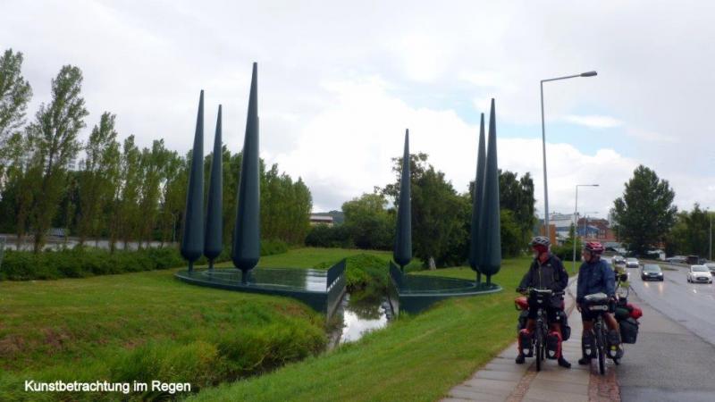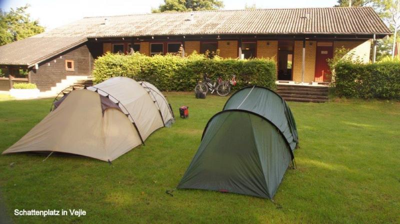 Am Morgen die gleiche Situation wie bisher an allen Tagen in Dänemark. Das Zelt ist am frühen Morgen von außen und innen nass. Aber die Sonne scheint, jedoch nicht auf unseren Zeltplatz. Die Schatten der hohen Bäume werden in den nächsten Stunden keinen Sonnenstrahl bescheren. Heiner schlägt vor, das leere Zelt in die Sonne zu tragen. Gesagt getan. So schaffen wir es, vor dem nächsten Regenguss das Zelt und alle Packtaschen trocken auf die Fahrräder zu bekommen. Nach 2,5 km Fahrt schützen wir uns unter Bäumen vor einem Platzregen. Bei der Streckenplanung am Vortag hatten wir die von Jürgen bevorzugte Straßenroute 170 oder den Radweg Nummer 55, den sogenannten „Grønlandsvej Tiufkær“ über Horsted und Klattrup, im BaseCamp Planungsprogramm in Erwägung gezogen. An der Straßenkreuzung vor uns verläuft der Radweg in einem dichten Wald und kann möglicherweise einen „überdachten“ Fahrweg bieten. Wir treten die Flucht unter die Bäume an, aber nach mehreren 100 m, aufgrund eines extremen Anstieges bei aufgeweichtem Waldweg und rutschenden Rädern müssen wir wieder aufgeben. Ist das überhaupt der richtige Weg? Gibt es Alternativen? Im kleinen Display des GPSmap 62s verschwindet beim Herauszoomen ein Teil der Ortschaften und die Gesamtübersicht geht verloren. Eine Routenübertragung vom Notebook aus der Software BaseCamp hatte ich nicht durchgeführt, da die Landstraße 170 als schnellere Verbindung geplant war. Eine detailreiche Karte zur Unterstützung und Groborientierung besitzen wir leider nicht und so treten wir wieder den Rückweg an. Die verlassene Straße im Startort Vejle ist schnell gefunden und die Überlandstraße 170 per Navi angesteuert. In zwei langgezogenen Kurven geht es in 4 km von 25 auf 100 Höhenmeter. Dann immer weiter auf der 170, die zum Glück teilweise von einem Radweg begleitet wird. Die Straße ist durch den Wind schnell abgetrocknet und so bleibt uns das Spritzwasser der vorbeirauschenden Fahrzeuge erspart. 5 km vor Kolding wird die Straße zur Autoschnellstraße und wir verlieren an einem sehr großen Kreisverkehr unseren Radweg, da keine Beschilderung zu finden ist. Mit der erwähnten kleinen Übersicht im Navi, finde ich nach einem Kilometer auf der für Fahrräder nicht erlaubten Autostraße eine Alternative, die uns jedoch in einem östlichen Bogen und damit in einem längeren Umweg in die Stadt Kolding führt. Dort nehmen wir am Rathausplatz unser vorbereitetes Mittagsbrot ein und steuern wieder die 170 an. Auf der Strecke weht weiterhin ein kräftiger Süd-Westwind und ab und zu sorgt ein leichter Regenschauer dafür, dass wir ordentlich strampeln müssen. Ab und zu schaut auch mal die Sonne nach uns und trocknet die Regenkleidung. Je näher wir unserem Etappenziel Haderslev kommen, desto mehr verdunkelte sich der Himmel. Das Danhostel mit Campingplatz am Haderslev Fjord war im Navi leicht auszumachen und schnell angesteuert. Der Regenguss holte uns am Zeltplatz doch ein und wir wollten die Schauer vor dem Zeltaufbau abwarten. Beim Abstieg vom Fahrrad traute ich meinen Augen nicht. Ein blinkender Riss im Metall entlang der Schweißnaht am oberen Querrohr meines Rades ist unverkennbar. Genauer betrachtet ist das nicht nur vorne der Fall, sondern ein weiterer Riss ist seitlich auch auszumachen. Die Sattelstütze wackelte und der Riss öffnete sich leicht. Es war nicht auszudenken, was passiert wäre, wenn bei einer Schussfahrt (so eben noch von der 170 runter in den Ort durchgeführt) der Rahmen unter dem Sattel und mir weggebrochen wäre. Ich rief Jürgen herbei und mir wurden die Knie weich. „Ich befürchte, damit ist die Tour für dich zu Ende“, sagte Jürgen trocken. Es ist nicht zu fassen, 60 km vor der deutschen Grenze und ca. 500 km vor Lübeck stehe ich vor dem Aus. Was tun? Reparieren lassen – Aluminium schweißen ist nur von Fachbetrieben möglich. Jürgen holte bei Ferdi in Königsdorf Rat ein. Er riet von einer Reparatur ab, da möglicherweise die 10-Jahre-Garantie beim Hersteller ROSE verloren geht. Der diskutierte Schadensersatz ist für mich jetzt und hier kein Thema, sondern die Sorge, wie komme ich mit Gepäck und Fahrrad nach Hause und wie kommen die Kameraden weiter. Was schwer wiegt – ein zweites Stück der „Ostseeumrundung“ fehlt mir! Nun, ich muss nach vorne sehen und rufe meine Freunde im 60 km entfernten Flensburg an, wo wir am nächsten Tag übernachten wollen. Sie versprechen, mich am nächsten Tag samt Fahrrad abzuholen. Da ein Teil meiner Familie in einer Woche in der Nähe von Lübeck Urlaub macht, ist der weitere Rücktransport nach Hause auch sicher gestellt. Heiner hat eine Tomatensuppe mit reichlich Nudeln und für jeden zwei kleine gekühlte Bierdosen in der kleinen Küche vorbereitet. Wir sitzen dann noch lange auf unseren Dreibeinhockern und sprechen das Erlebte und verschiedene Lösungsvarianten noch mal durch. Ich schreibe noch etwas am Blog und schlüpfte kurz vor Mitternacht in den Schlafsack. Die Müdigkeit ist so groß, dass ich trotz der Ereignisse schnell tief einschlafe.