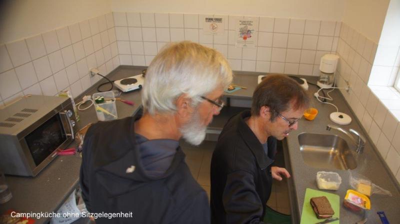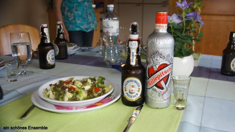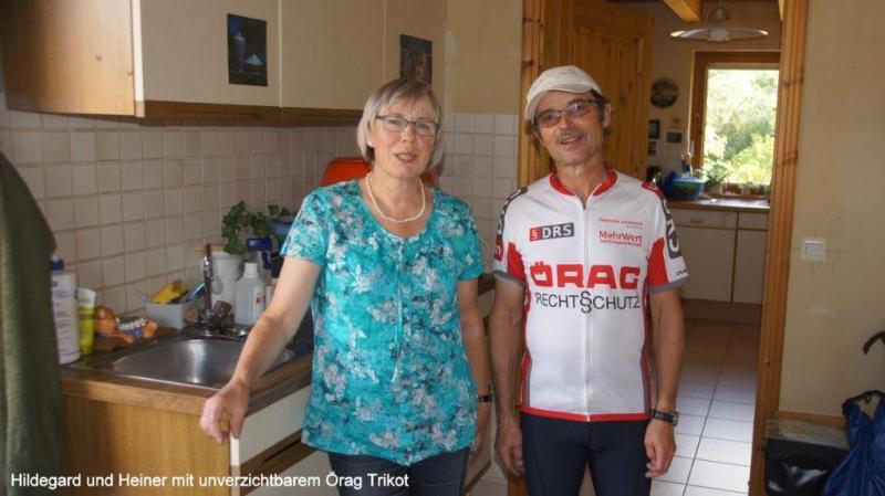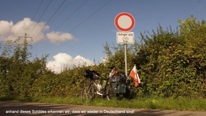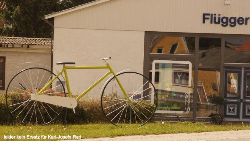 Wir sitzen beim Frühstück in der Küche auf unseren Dreibeinhockern und beratschlagen über unser weiteres Vorgehen. Karl-Josef wird heute Nachmittag um 17:00 Uhr von seinem Freund Wilfried aus Flensburg abgeholt. Jürgen und ich wollen mit dem Rad dorthin fahren. Karl-Josef will in der Zeit zwei Blogs fertig schreiben und das Zelt abbauen, wenn es aufhört zu schauern. Karl-Josef bietet auch großzügig an, sich auch noch die letzten Tage an den Kosten zu beteiligen und Jürgen wird von uns gelobt, dass er das Geld so gut zusammengehalten habe. Wir packen, können noch Gepäck zurücklassen und fahren los. Der Regen hört nach kurzer Zeit auf, die Sonne scheint, der Wind kommt von Westen und hilft uns ganz gut voranzukommen, wenn es auch immer bergauf und bergab geht. Wir sind daher schon um 12:30 Uhr in Aaren. Wir besuchen das Touristikbüro und setzen uns zum Picknick auf eine Holzbank. Ich beobachte die Preise gegenüber an einer Eisdiele. Drei Kugeln 30 Kronen! Kostete in Schweden dasselbe, nur mit dem Unterschied, dass eine schwedische Krone mit 1,14 Euro und die dänische mit 1,45 Euro bewertet wird. Dann geht es weiter Richtung Grenze und wir lassen uns noch vorher auf ein Eis und einen Kaffee in einer Imbissstube nieder. Wir haben noch reichlich Zeit. Um 16:30 Uhr kommen wir an die dänisch-deutsche Grenze. Die offizielle Straße darf von Fahrrädern aber nicht befahren werden. Ca. 500 m vorher biegt ein kleiner Pfad von der Straße ab, der als Fahrradroute ausgewiesen ist. Über eine grobe Kopfsteinpflasterstraße geht es weiter. Aber nirgendwo ist hier zu erkennen, wo hier die Grenze ist. Am 3. Mai hatten wir die polnische Grenze überschritten und wir sind alle das erste Mal so lange, nämlich drei Monate und 10 Tage, im Ausland gewesen. Wir stellen am Ziel in Flensburg-Harrislee nach ca. 60 Kilometern fest, dass uns noch 3 Kilometer fehlen, um mit Karl-Josef die 7000 feiern zu können, entscheiden uns aber ehrlich zu bleiben und das Ziel nicht zu verfehlen. Wir werden von Hildegard ganz herzlich willkommen geheißen und bestaunen erst einmal das schöne Haus ganz aus Holz und den schönen Garten. Karl-Josef und Wilfried kommen auch nach einer Weile und wir sind zum leckeren Abendessen eingeladen. Das erste Mal nach drei Monaten gibt es auch wieder leckeren Rotwein. Nach vielem Erzählen gibt es noch einen schönen Liederabend. Wilfried holt seine Gitarre und stellt auch Jürgen eine zur Verfügung. Wir bekommen Mundorgeln und dann geht es zwei Stunden los. Bei den alten Schlagern − von Wilfried gespielt und gesungen − und den kölschen Liedern von Jürgen können wir nur bedingt mitsingen. Es war richtig schön und wir gehen wein- und biertrunken ins Bett.