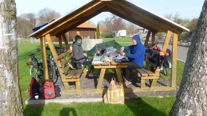 Bei blauem Himmel und wieder den Wind im Rücken machen wir uns von Neuhaus auf den Weg um den Saaler Bodden nach Zingst, wo wir in einer Pizzeria kräftig zu Mittag essen. Von dort geht es auf Fahrradwegen nach Barth und hier beschließen wir über Landstraße die Strecke nach Stralsund abzukürzen. Ungefähr 15 km vor Stralsund finden wir in Duvendiek einen „Naturcampingplatz“, sehr gepflegt und mit einer überdachten Sitzgelegenheit. Da wir es verpasst hatten einzukaufen, gab es geschmierte Brötchen noch vom Frühstück und kaltes Bier an der Rezeption zu kaufen. Da es am Abend wieder bitterkalt wurde, schlugen wir den Vorschlag des Campingplatzbesitzers aus, mit seiner Frau in den 1. Mai zu tanzen und verkrochen uns in unsere Schlafsäcke!