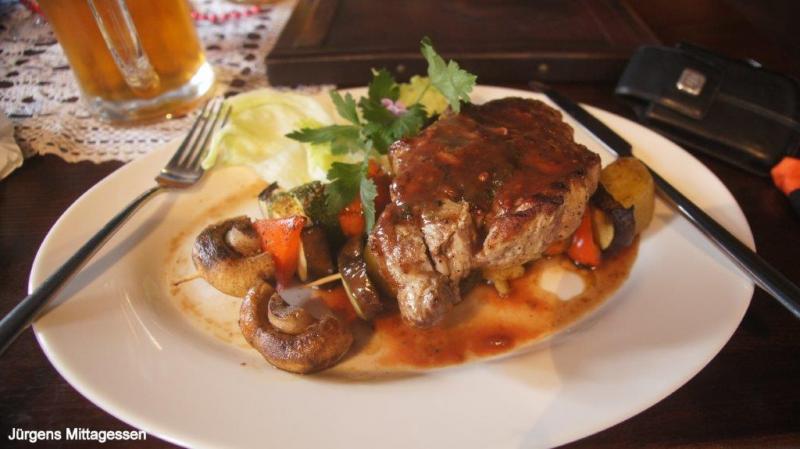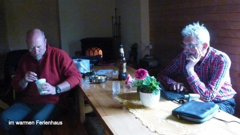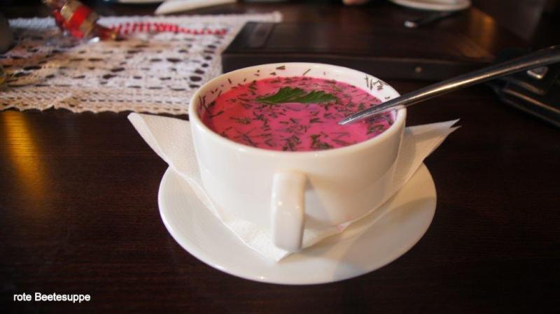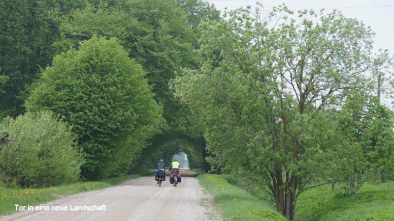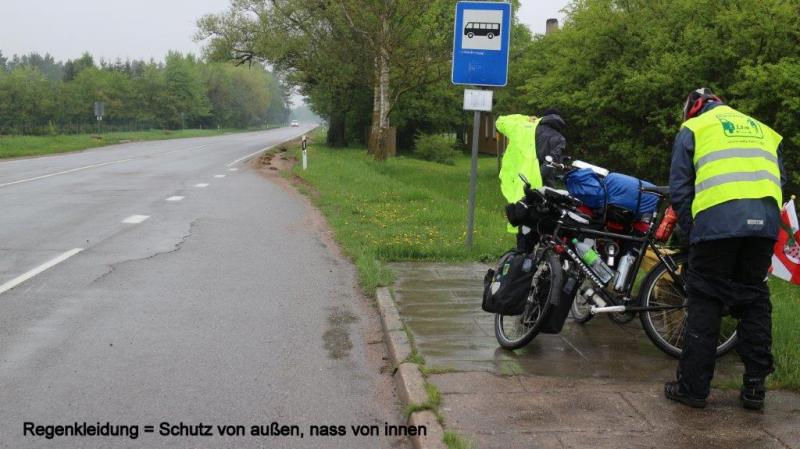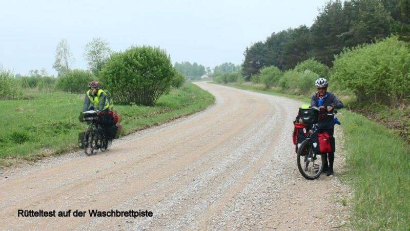 Beruhigendes Trommeln des Regens auf das schützende Blechdach der Veranda lassen mich bei angenehmen Nachttemperaturen gut schlafen. Durch mein Nachtquartier habe ich mir das Auf- und Abbauen des Zeltes erspart und was wichtiger ist, es ist trocken geblieben im Gegensatz zu Karl-Josefs Zelt! Zum Schutz vor lästigen Plagegeistern habe ich mir meine Kopfbedeckung und das Mückennetz über den Kopf gezogen, um so alle Angriffe auf nicht eingepackte Körperteile abzuwehren, was sich dann auch als sehr wirkungsvoll erwies. Glücklicherweise haben überall herumkrabbelnde große Waldameisen den Weg in den Schlafsack nicht gefunden. Auch in dieser Nacht bleibt das Gewitter auf Distanz. Wir hören es nur in der Ferne grummeln, aber es schüttet doch kräftig. Nach dem Aufwachen mache ich erst einmal heißes Wasser. Es gibt einen Gasherd und große 5-Liter-Kanister mit Trinkwasser. Das Leitungswasser ist nur zum Duschen und für die Toilette geeignet. Natürlich bringe ich Karl-Josef einen frischen Kaffee in sein Zelt, der ja die Nacht mutig hier ausgehalten hat und trotzdem einen ganz vergnüglichen Eindruck machte. Da wir mit unseren Tagebuchberichten etwas im Rückstand waren, nutzten wir die nicht endende Regensituation zum Schreiben. Leider haben wir hier keine Internetverbindung, so dass wir nichts verschicken können. Unsere nass geschwitzte Wäsche vom Vortag hatten wir teilweise gewaschen und dann unter dem Dach der Veranda zum Trocknen aufgehängt, aber gefühlsmäßig war diese nasser als vorher. Wir trödeln bis in den späten Vormittag rein, um die Abfahrt in den Regen zu verzögern. Als es eine kurze Schauerminderung gibt, wagen wir den Ausritt mit kompl. Regenmontur. Glücklicherweise ist die A11 (bildet hier auch den R10) nicht stark befahren, trotzdem erwischen uns so manche Fontänen von Autos, wenn sie durch die ausgeprägten Spurrillen der Fahrbahn fahren, in denen sich das Regenwasser ansammelt. Keine 20 km weiter kommen wir durch die Stadt Liepāja und finden dort im immer noch strömenden Regen ein Restaurant. Unsere Räder stellen wir unter große Biergartenschirme (schöner Biergarten) ins Trockene. Das Restaurant ist schon von gehobenerem Niveau und dennoch gibt es keine Bemerkungen wegen den Wasserpfützen, die sich um die Garderobe bilden von unserer nassen und aufgehängten Regenkleidung. Der Kellner spricht perfekt Englisch und auch die Speisekarte ist in Englisch. Heiner bestellt wie immer…..na, was,….Fisch und ich „ausnahmsweise“ ein Fleischgericht. Ein leckeres, nicht zu kleines Steak auf Burgundersoße und 2 Spieße mit verschiedenen Gemüsestücken und Kartoffelstücken, die ebenfalls auf diese Spieße aufgereiht waren. Das Ganze noch garniert mit frischem Salat und einer lila Blüte (s. Foto). Als Vorspeise gibt es eine kalte Rote-Beete Suppe, mit Stücken von gekochtem Ei und in Streifen geschnittene Äpfel. Eigentlich stehe ich nicht so auf Rote Beete, aber das war richtig lecker. Für jeden noch ein großes Bier (0,5 l) und einen Kaffee hinterher haben wir ca. 30 lat (45 €) bezahlt. In der Zwischenzeit hatte der Himmel sich doch tatsächlich überlegt, seine Schleusen mal zu schließen. So fuhren wir dann trocken aus der Stadt heraus auf der Suche nach einer kleinen Straße, die uns an den Rand eines Naturschutzgebietes bringt. Die Straße entpuppt sich auf 13 km als absolute Waschbrettrüttelpiste, was unsere Stimmung dann doch wieder gegen 0 laufen lässt. Auf der dann doch längeren letzten Strecke fahren wir zwar immer noch über Schotter, aber die waschbrettartigen Auswaschungen, die ein Radeln mit Gepäck zur Tortur werden lassen, nehmen zum Glück ab. Nach etwas mehr als 50 km erreichen wir das kleine Dörfchen Bernāti und suchen dort ein Geschäft auf, um unsere Lebensmittel aufzufrischen und zu erfragen, wo es einen Zeltplatz gibt. Eine sehr nette und Englisch sprechende Verkäuferin gibt uns eine Visitenkarte und bietet an, da die Vermieterin kein Englisch spreche, sondern nur ein wenig Deutsch, für uns dort anzurufen, was sie dann auch macht. Wir entscheiden uns anstelle des Zeltes wegen unserer durchnässten Kleidung für eine Hütte Sie klärt alles mit der Frau und die Hütte entpuppt sich als kompl. Ferienhaus, mit Küche, großem Aufenthaltsraum, der für uns extra beheizt wird und einer wunderschönen Sauna, die wir allerdings nur - auf Anraten der Frau - als Trockenraum nutzen. Obwohl Karl-Josef fiel es schon schwer, hierauf zu verzichten. Der Schlafraum befand sich im Obergeschoss, der über eine steile Holztreppe erreichbar und mit 11 Betten bestückt war. Die Frau war sehr bemüht uns alles herzurichten. Die Fahrräder durften wir - so dreckig sie auch waren – in den Aufenthaltsraum stellen. Für die Übernachtung mit 3 Personen haben wir 20 Lat = 28 € bezahlt. Den Abend gestalten wir der Landestradition entsprechend mit 2 x 2 l Flaschen Bier (Kunststofflaschen). Eine mit 4,9 %, die andere Flasche mit 7 % Alkohol, die uns in eine bierselige Stimmung versetzen. Aber, geneigte Leserschaft, wir haben nur verfolgt, was uns die Gesundheitsfachleute immer versuchen nahezubringen: beim Sport möglichst viel trinken! Ok, zur Neutralisation gab es zwischendurch noch 2-3 Gläschen Wodka, natürlich nur um uns der „Landestradition“ anzupassen! Wieso gab es denn so reichhaltig Speis und Trank? Nun weil wir doch der netten Verkäuferin, die uns die Ferienwohnung vermittelt hatte, doch etwas zum Umsatz schuldig waren. Das wir einen wunderbaren Schlaf hatten, erübrigt sich zu erwähnen. Aber nach der regnerischen und durchnässenden Fahrt ein Segen, an den wir nicht im Traum gedacht hätten. Beim Einschlafen aber auch noch kurze Sorgengedanken auf den morgigen Tag. Wird die Flüssigkeitsaufnahme uns morgen einen klaren Kopf bescheren und der hl. Petrus uns trockenes Wetter bescheren?