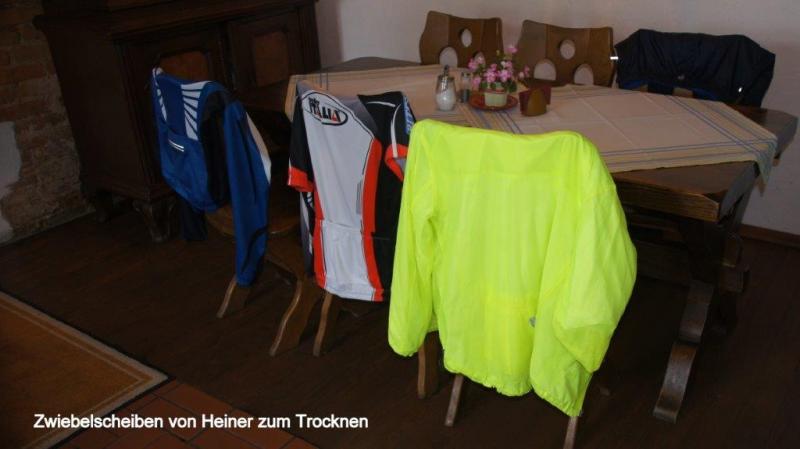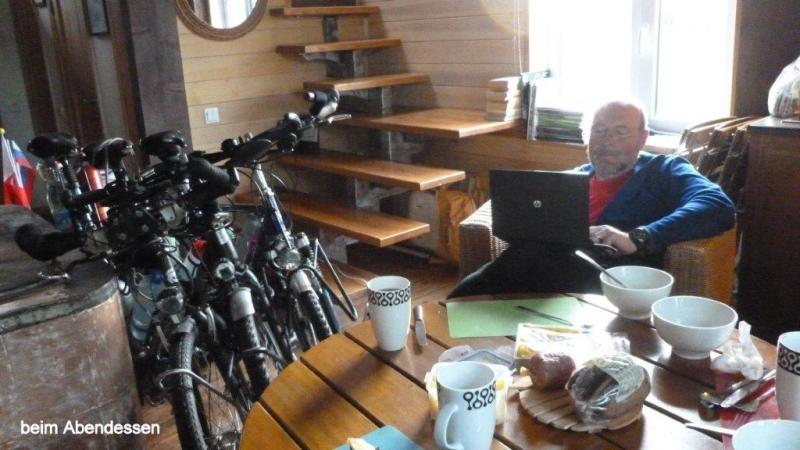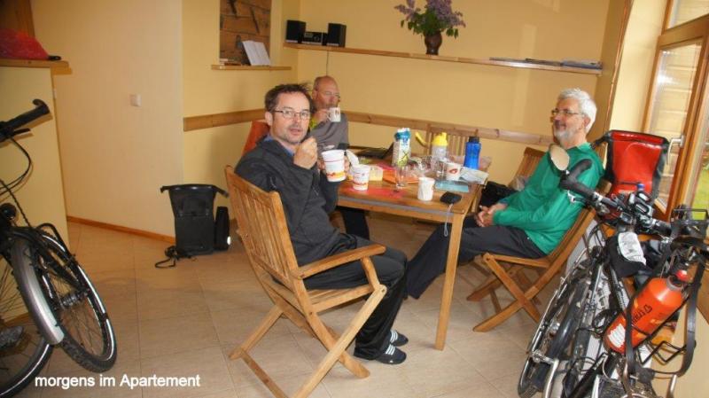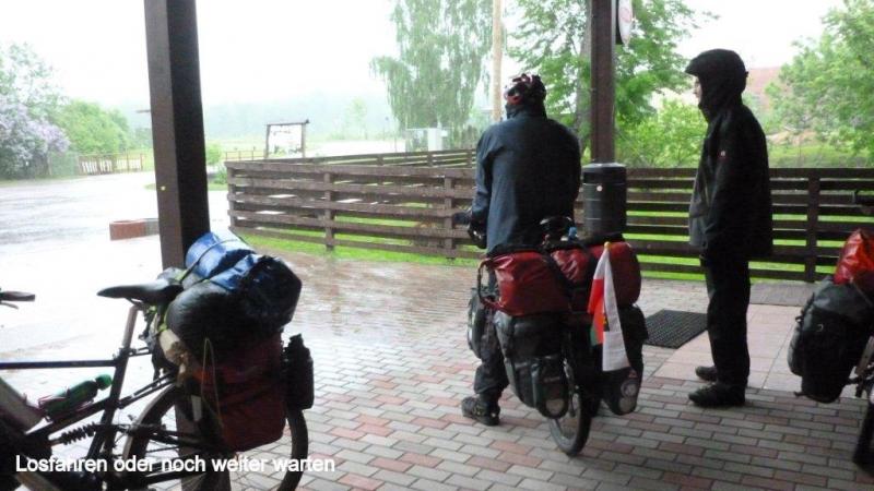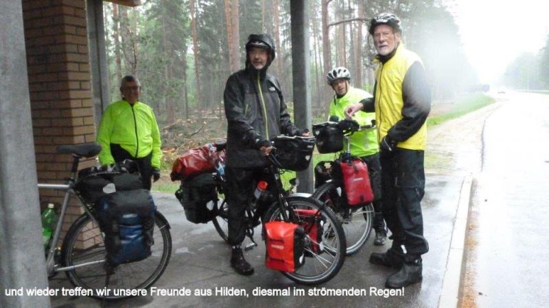 Morgens kommen wir (Heiner) schwer aus den Federn. Wein und Wodka lassen grüßen! Draußen sieht es trübe aus, es fängt kräftig an zu gießen und wir haben gar keine Lust, in die nasse Welt heraus zu treten. Die liebe Ina erkundigt sich per Handy nach meinem Wohlergehen und holt sich einen enormen Wissensvorsprung gegenüber der übrigen geschätzten Leserschaft. Nachzutragen wäre meine tatsächlich sehr gute Erfahreng bei der noch jungen Zahnärztin. Die Praxis gehört wohl zu einem größeren Klinikverbund und war hervorragend ausgestattet, soweit ich das als Laie beurteilen kann. Morgens angemeldet, hatte ich nachmittags 16:00 Uhr bereits einen Termin. Habe im Wartezimmer kurz nur gewartet, Zahn wurde am Platz geröntgt und fotografiert. Erläuterung und Klärung über das weitere Vorgehen erfolgte mit Hilfe eines sehr überzeugenden Übersetzungsprogramms: Sie schrieb in Russisch, ich in Deutsch! Ich war mir nicht sicher in Englisch alles genau verstanden zu haben. Ein Teil der Wurzel konnte trotz größter Mühe nicht entfernt werden. Nach gut einer Stunde musste ich dann umgerechnet ca. 42 Euro zahlen und hatte nach Nachlassen der Betäubung keine Schmerzen. Der Finne, der sich im Hostel in Riga zu uns an den Frühstückstisch gesellte und gut Deutsch sprach, da er in Berlin studiert hatte, hatte ja berichtet, dass es einen richtigen Zahnarzttourismus nach Riga gibt. Er selbst würde sich ein Implantat in einer Spezialklinik machen lassen und incl. neuen Zahns insges. 1000 Euro zahlen. Zurück zum Mittwoch auf dem Weg nach Tallinn. Um ca. 11 Uhr rafften wir uns endlich auf in den strömenden Regen hinaus zu gehen. Draußen unterhalten wir uns noch mit dem Campingplatzbesitzer in Deutsch. Er selbst ist Maschinenbauingenieur und vertritt in Lettland eine Niederlassung des in Asbach im Westerwald mit mehreren Mitarbeitern weltweit wohl größten deutschen Straßenbaumaschinenhersteller. Der auf Nebenstrecken bitter nötige Straßenbau wird zu 50 % von der EU gefördert. Wir fahren 11:15 Uhr los und die etwas wasserscheuen Kollegen – es hat aber auch geschüttet! – stärken sich an der nächsten Ecke noch mit einem weiteren Kaffee, um den Schauer abzuwarten. Draußen entdecke ich einen Maikäfer, der noch das Schwimmen lernen muss. Dann nehmen wir allen Mut zusammen und es geht weiter auf der Schnell- / Küstenstraße A1. Ich denke nur, hoffentlich bleiben die Räder heil bei dem Wetter. Gefährlich nahe kommen die LKWs immer dann, wenn Gegenverkehr herrscht. Mit guter Regenausrüstung – ich trage jetzt auch immer meine Keensandalen mit Socken und GoreTex-Socken darüber, damit das Wasser immer gut herausfließen kann; auch die Beinkleider unter der Regenhose sind sehr angenehm. Wir kommen gut voran und sehen bei der nächsten Bushaltestelle unsere Hildener Leidensgenossen – das Ehepaar Meermann – wieder. Nach kurzer Info über den Zahnverlauf und Gratulation an Karl-Josef zum Enkelkind (sie hatten unseren Blog durchforscht, Internet machts möglich!) gehts weiter auf dem Highway. Nach 2 ½ Stunden und 34 km kommen wir um 14 Uhr in Salacgriva an und finden auch schnell ein Restaurant. Wir beschließen angesichts des Dauerregens und der Gefährlichkeit im Regendunst mit den LKWs im Ort eine Bleibe zu suchen. Jürgen telefoniert und ein Blockhausbesitzer will uns in einer halben Stunde mit dem Auto abholen. Wir warten 1 ½ Stunden, der Besitzer entschuldigt sich und fährt ca. einen km mit dem Auto vor uns her in eine Seitengasse. Die Blockhütte hat unten zwei Schlafzimmer. Da die zwei Betten in meinem Zimmer nur knappe 170 cm groß sind, habe ich ein Einzelzimmer. Während Karl-Josef und ich eine Suppe und Tee kochen, erkundigt sich Jürgen nach den Preisen der Fährverbindung Tallin nach Helsinki, die wir voraussichtlich nächsten Montag nutzen werden. Es gibt noch - von Karl-Josef gekocht – eine hervorragende Champignonsuppe mit gefüllten Fleischklößchen zum Abendessen. Leider haben wir kein Bier gekauft und es gibt die letzten Tropfen Wodka, die ich am Abend vorher übergelassen habe.