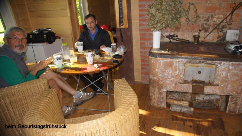 Beim Aufwachen geht der erste Blick zunächst einmal durchs Fenster, um die aktuelle Wetterlage zu ermitteln. Es sieht ganz gut aus. Zum Frühstück wird das letzte Brot verteilt, Käse und Blockwurst gibt es noch genug. Wegen des stinkenden Leitungswassers nehmen wir das gekaufte Wasser aus der Leitung für den Kaffee. Als Heiner aus seinem Separee auftaucht, singen wir ihm erst einmal aus voller Brust ein Geburtstagsständchen. Der Frühstückstisch ist mit Kerzen geschmückt und der dampfende Kaffee wartet schon. Auch mein Smartphone liegt an Heiners Platz, um ihm die schon vielen eingetroffenen Geburtstagswünsche (als Kommentare auf unserem Blog) zu zeigen. Auch erste Anrufe kommen und begleiten das Frühstück. Nach den letzten Regentagen brauchen unsere Fahrradketten mal eine Pflege. Erst Fettlöser mit Rückfettung und dann das gute Rohloffkettenfett wieder drauf und es fährt sich danach wie geschmiert. Trotz der Geburtstagsumstände und der Pflegeaktion für die Räder sind wir kurz vor 10:00 Uhr abfahrtbereit. Zunächst geht es weiter auf der Via Baltica, der Transitstrecke zwischen Riga und Tallinn. Aber heute Morgen scheint die Sonne und so fährt es sich deutlich sicherer. Auch heute kommen uns 2 einzeln fahrende Reiseradler entgegen, man grüßt freundlich. Schon vor der Grenze biegt eine Straße in Richtung Küste ab und wir fahren entschieden stressfreier parallel zur A1. Bis zur Grenze sind es nur noch 13 km und wir nutzen eine Einkaufmöglichkeit, um unsere letzten Lats, die lettische Währung auszugeben. Um allen Befürchtungen zu begegnen, wir gewöhnen uns nicht an den Wodka, sondern müssen nur vorbeugen, da ab Finnland der Alkoholgenuss unerschwinglich wird. Gegen Mittag setzt ein kurzer Nieselregen ein, den wir nutzen, um in dem Ort Häädermeeste zu Mittag zu essen. Das Essen war fastfoodmäßig aber das Bier eine Katastrophe, das nur mit Hilfe einer Zitronenlimo annähernd erträglich wurde. Der Nieselschauer war dann aber zu Ende und so ging es noch etliche Kilometer auf separater Straße weiter. Als wir Nachmittags anhalten, um den Geburtstagskuchen zu essen, erschrecken wir, da sich hinter uns schwarze Wolken auftürmen. So bleibt die Pause nur kurz und wir schwingen uns wieder auf die Drahtesel um die Pedale in Rotation zu bringen. Leider müssen wir wieder über die A1, aber zunächst bleibt es trocken. Die Gewitterfront kommt dann auch von der Seite bedrohlich auf uns zu und wir legen noch einen Zahn zu. Zwischendurch kurze Abstimmung, ob wir weiterfahren sollen oder doch in dem Ort Uulu eine Unterkunft suchen sollen. Es sind noch rund 18 km bis in die Stadt Pärnu. Wir beschließen weiterzufahren, haben aber kurz danach eine verregnete Straße, die Autos ziehen den Regenschleier hinter sich her. Das Gewitter grummelt und wir erschrecken durch Blitze, die neben und hinter uns aufleuchten. Aber welch ein Wunder, es kommt kein Regen. Der Regenschauer ist uns wohl vorausgegangen. Aber wie lange hält es uns noch trocken? Das Gewitter treibt uns mit starken Böen immer weiter auf Pärnu zu. Kurz vor der Stadt geht eine ausgewiesene Fahrradroute ab. Mit 25 – 30 km/h jagen wir durch den Stadtgürtel bis wir ein Schild sehen mit einem Bett, was wir als Unterkunftsmöglichkeit deuten. Aber wir kommen in eine Hochhaussiedlung ohne weiteren Hinweis. Wir fragen Passanten und werden auf ein ca. 4 km entferntes Hotel verwiesen. Es wird immer dunkler und es fängt nun langsam auch an zu (zum Glück nur) tröpfeln. Wieder geht es in Höllentempo weiter, bis eine Straßenbaustelle uns zwingt langsamer zu fahren. Karl-Josefs Navi führt uns aber durch verwinkelte Straßenzüge durch die verschiedenen Baustellen, bis wir vor einem Hostel stehen. Es fängt stärker an zu regnen. Ich gehe mit Heiner ins Hostel zur Rezeption, frage ob noch ein Zimmer mit 3 Betten frei ist und was es kostet. Da die Frau an der Rezeption nur schlecht Englisch spricht, bietet sie ein Zimmer zu 52 € an. Dann meint sie, dass es noch 3 x 13 € gibt, was ich zunächst so interpretiere, dass somit noch 39 € drauf kommen. Das wäre die teuerste Übernachtung unserer bisherigen Reise. Zum Glück klärt es sich dann so auf, dass das Zimmer zu 39 € nur eine Alternative war, so dass wir natürlich sofort einwilligen. Die Fahrräder können wir unten im Treppenhaus abstellen. Als wir unser Zimmer bezogen haben und das Fenster öffnen, strömt der Regen nur so runter. Wir sitzen in einem schönen trockenen Zimmer und Heiner kocht uns aus unseren Vorräten ein leckeres Abendmahl. Nach dem Duschen machen wir uns noch auf, da Heiner uns noch zu einem Bier auf seinen Geburtstag eingeladen hat. Um 10:00 Uhr meint die Bedienung, dass das Lokal schließt und wir leider nichts mehr bestellen können. Glück für Heiner, sonst wären es noch einige Bier mehr geworden. Insgesamt ein spannender aber auch sehr glücklicher Tag.