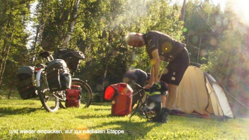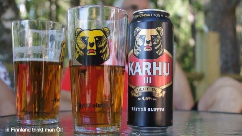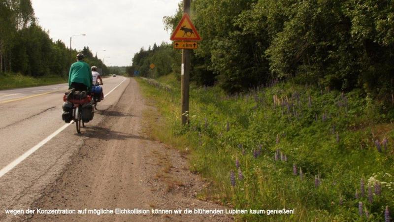 Frühaufsteher muss man in Finnland wirklich suchen. Liegt das möglicherweise an der langen Helligkeitsphase während der Sommerzeit? Aktuell ist es gerade mal vielleicht 3 Stunden dunkel! Aber es hat ja auch etwas für sich, wenn es morgens ruhig und gelassen zugeht. Vielleicht liegt es auch am Saunen, da Heiner am Vorabend, wie gefühlte 80% der Campingplatzbewohner, auch noch in die Sauna geschlüpft war und somit wie alle anderen Finnen heute Morgen nicht in die Senkrechte kommen mochte. Nur hatte Heiner die Sauna erst nach der ausgewiesenen Zeit besucht und wurde dann aber abrupt durch ein Pärchen, das die Sauna wohl für sich alleine haben wollte, vertrieben. Dennoch meinte er am nächsten Morgen nur, dass er nach einem Saunabesuch besonders gut schlafen könne. In einer kleinen Blockhütte wird auf Elektro-Kochplatten schnell das Kaffeewasser aufgesetzt und der Tisch feierlich geschmückt. Denn schon wieder wird einer während unserer Abenteuertour ein Jahr älter. Ok, so etwas passiert halt, wenn man so lange unterwegs ist! Nun meine Hoffnung ist ja, dass wir zu meinem Geburtstag Ende November die Ostseeumrundung abgeschlossen haben! Diesmal feiert Karl-Josef sogar einen halb gerundeten Festtag. Natürlich erhält er aus 2 vollen Kehlen ein überragendes Geburtstagsständchen geschmettert, dessen Echo im Laufe des Tages durch Anrufe per Handy noch nachhallt! Da wir einige Tage ohne Internetverbindung sind, wird er die vielfältigen Kommentare in unserem Blog erst später entdecken. Die noch am Morgen gehegte Hoffnung, dass wir im Tagesverlauf nun endlich wieder ebenere Strecken erwischen, stellt sich als trügerisch heraus. Die Finnen bauen ihre Straßen immer den geologischen Strukturen nach. Dies bedeutet, dass Fahrradwege, wenn sie separat geführt werden, auch schon mal mehr ins Tal oder den Berg rauf gehen. Landstraßen nehmen alle Verwerfungen mit, die die Natur hergibt. Nur bei der parallel verlaufenden Autobahn, da hat man sich bemüht Berg und Tal zu egalisieren. Bei aller Anstrengung, die uns heute abverlangt wird, erfreuen uns kilometerlang blühende Lupinen, die in den verschiedensten Farben blühen. Zum Mittagessen geht es in ein Fastfood Restaurant (leider ohne WiFi) und wir laden Kalorien auf. Dazu gibt es hier in Finnland wie in jedem Restaurant Wasser in einer Glaskaraffe und entsprechende Gläser. Ja, wer hätte das gedacht, dass uns nach dem mäßigen Bierkonsum in Polen und dem Baltikum nun gekühltes Leitungswasser wie ein Labsal erscheint. 3 solcher Kannen werden geleert, bevor es dann weiter geht. Über den weiteren Streckenverlauf gibt es wenig zu berichten, außer dem ewigen Auf und Ab im Streckenverlauf. Bei hochsommerlichen Temperaturen, die uns zusätzlich zu schaffen machen, haben wir uns schon nach 60 km für einen Campingplatz auf einer Insel südlich der Stadt Salo entschieden. Die Insel kann durch eine angeschüttete Landverbindung erreicht werden. Nachdem wir die Platzverwalterin überzeugt haben, dass unser kleines Zelt doch nicht auch noch 17 € kosten darf, lädt uns Karl-Josef zu einem leckeren Bierchen ein. Wir trinken auf sein Wohl, haben es uns aber heute auch wirklich verdient. Mit einer kompletten Küche auf dem Platz zaubern meine Mitstreiter noch ein leckeres Abendessen und wir erleben noch einen bezaubernden Sonnenuntergang. In einer Grillhütte haben sich einige Finnen versammelt und schmettern zu Akkordeon und Gitarre schöne Volksweisen. Und wieder haben wir das Gefühl, dass reichlich Alkohol mit im Spiel ist. So genießen auch wir noch mal auf Karl-Josef ein kleines Tröpfchen aus der silbernen Plastikflasche, bevor wir in die zum Schlafen vorbereiteten Säcke krabbeln. Nur kurz kommen Fragen und Zweifel auf, ob wir denn die morgige Mammutstrecke von ca. 100 km bis zum nächsten Campingplatz schaffen. Aber dann versetzt uns die Anstrengung des Tages in einen traumlosen Schlaf. So, und nun liebe Kinder, gebt fein acht, ob die drei das denn morgen schaffen, wird euch im nächsten Bericht gesacht.