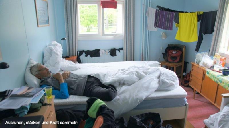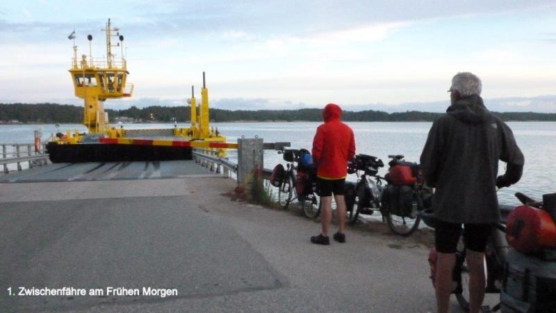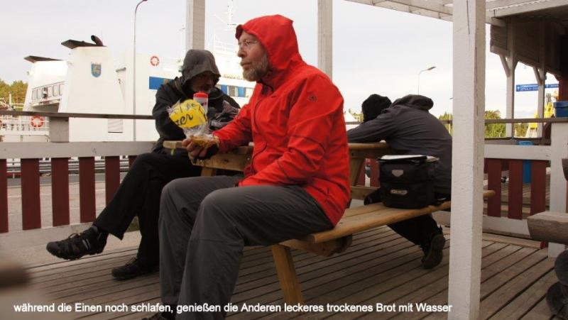 6:20 Uhr geht es endlich los Richtung Åland über Kökav und Sattunga nach Langnös. Erst mal wird auf der Fähre ordentlich gefrühstückt. Den zweiten Kaffee gibt´s für nur 50 Cent. Da wird ordentlich hin gelangt. Die Fähren sind in Finnland alle für Personen kostenlos. Räder kosten erst ab Ende Juni 5 Euro. Sie fahren von den Delfinen gezogen über 30 km/h schnell. Es wird geschlafen und noch am Blog geschrieben. Kurz nach Abfahrt beginnt ein Dauerregen, der auch bei Ankunft ca 13:00 Uhr in Langnös für die edlen Ritter nicht aufhören will. Dann geht es weiter im Regen nach Mariehamn. Dort will Altknappe Jürg, mittlerweile von Altritter Karl dem Schönen, Graf von Ellenburg, zum Jungritter Jürg der Streng, Abt von Königsdorf befördert - , noch einkaufen, weil er heute Abend sich die Ehre geben will, zu kochen. Jedenfalls kauft er das ganze schön gehäckselte Fleisch, das das Geschäft den edlen Rittern anbieten kann. Jungritter Jürg der Strenge, Abt von Königsdorf, ehemals Altknappe der Treiber, hat aber leider die Rechnung ohne die Wirtin des Hostels gemacht, das wir gegen 16:00 Uhr erreichen. Es gibt dort nämlich keine Kochgelegenheit für die Gäste. Wir essen Brot mit Aufschnitt, planen den Weiterritt und Ritter Hein der Träumer erlaubt sich danach noch zu lesen und Oldies mit iPod zu hören.