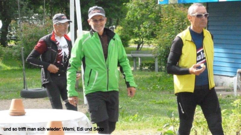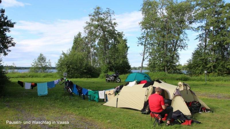 Morgens ausschlafen bis 7:30 Uhr. Beim Frühstück überlegen wir, wie es mit den Blogs weitergehen soll. Wir mussten die letzten Tage lange Strecken fahren, um den jeweils nächsten Campingplatz zu erreichen. Auch haben die Campingplätze nur noch selten Internetanschluss. Wir entscheiden auf Jürgens Vorschlag nicht einen Tag zum Trocknen zu bleiben sondern noch 25 km bei herrlichstem Sonnenschein weiter zu fahren, um zum nächsten Halt in Jakobstad nicht über 120 km fahren zu müssen. Gesagt, getan! Noch auf dem Weg einkaufen und dann kommen wir auch schon um ca. 15 Uhr in Vaasa an. Jürgen bereitet das Mittagessen in einer der acht kleinen Küchen vor, Karl-Josef und ich kümmern uns um zwei Billets für die Waschmaschine. Lange Wäscheleinen werden gespannt. Nach dem Aufhängen der Wäsche können wir uns auf die überdachte Terrasse in die Abendsonne setzen und sehen die drei Schweizer Musketiere Josef, Werner und Eddi herannahen. Sie freuten sich, dass wir auf sie gewartet hatten. Auch die Mädels Yvonne und Danica sollten sich schon auf dem Platz befinden. Da gab es dann noch viel zu erzählen und ich komme erst um 11 Uhr auf der Thermarestmatte zum Schlafen.